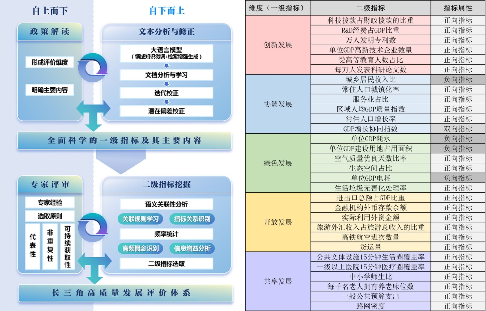 《报告》面向国家和地区对长三角的发展定位与要求,采用“自上而下”基于专家经验的政策解读法,结合“自下而上”基于大语言模型的文本主题挖掘技术,生成一套借助“众力”、更具公信力的高质量发展评价指标体系,包括5个一级指标和30个二级指标。基于该评价指标体系,《报告》综合给出了长三角41个地级市的高质量发展情况。