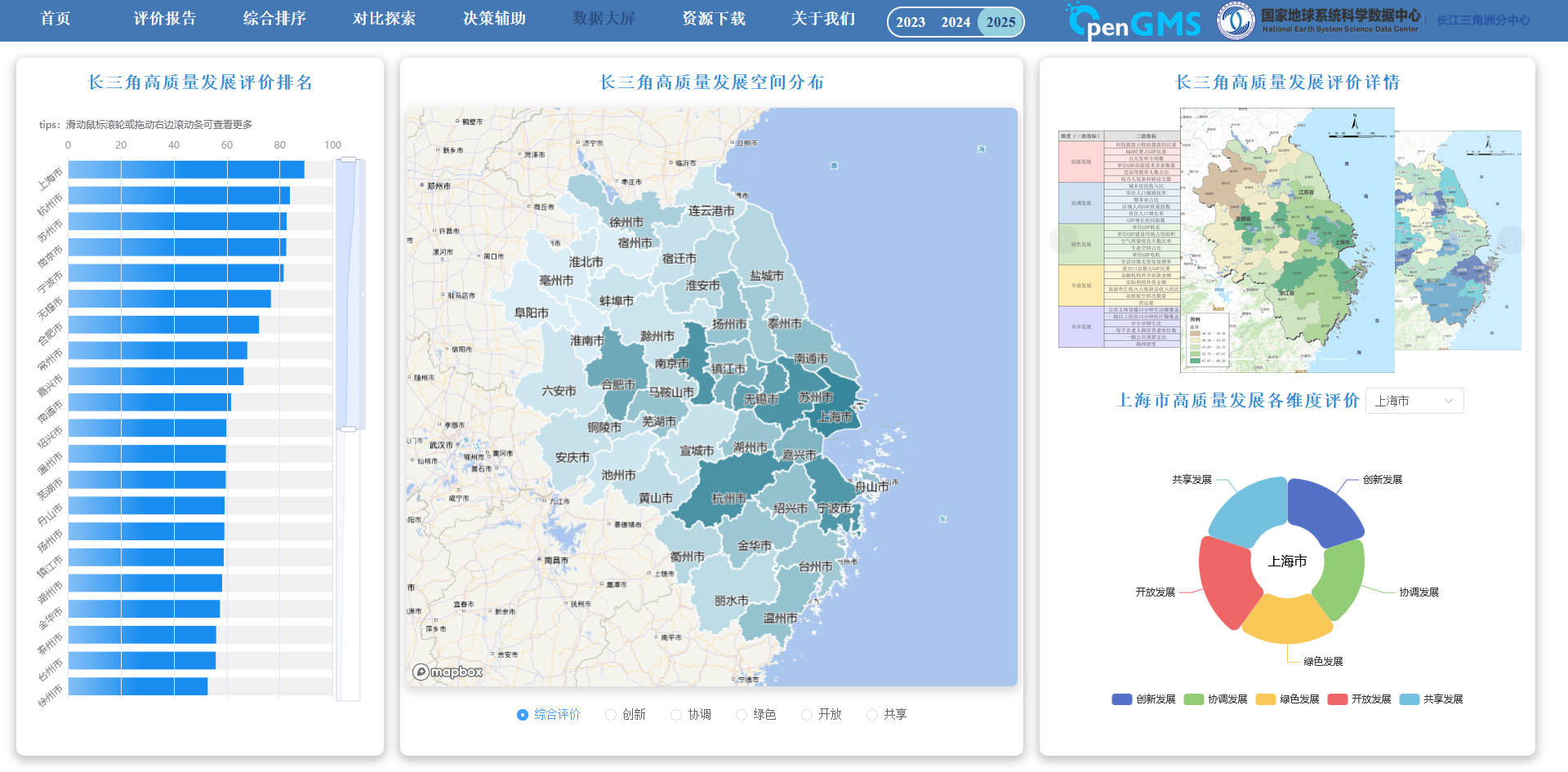自长三角一体化战略上升为国家级战略以来,其整体高质量发展态势和内部发展差异等问题一直备受关注。2023年底,南京师范大学地理科学学院发布了首份年度报告《长江三角洲高质量发展评价研究报告》(以下简称《报告》)。为持续追踪长三角高质量发展进程,由南京师范大学地理科学学院牵头,依托虚拟地理环境教育部和气候系统预测与变化应对全国重点实验室(南京师范大学),联合国家地球系统科学数据中心长江三角洲分中心、江苏省地理信息资源开发与利用协同创新中心、可持续发展大数据国际研究中心南京师范大学节点(培育)共同提供数据与技术支撑。2025年起,研究团队在报告中增加了年度对比,动态追踪长三角高质量发展的新变化。